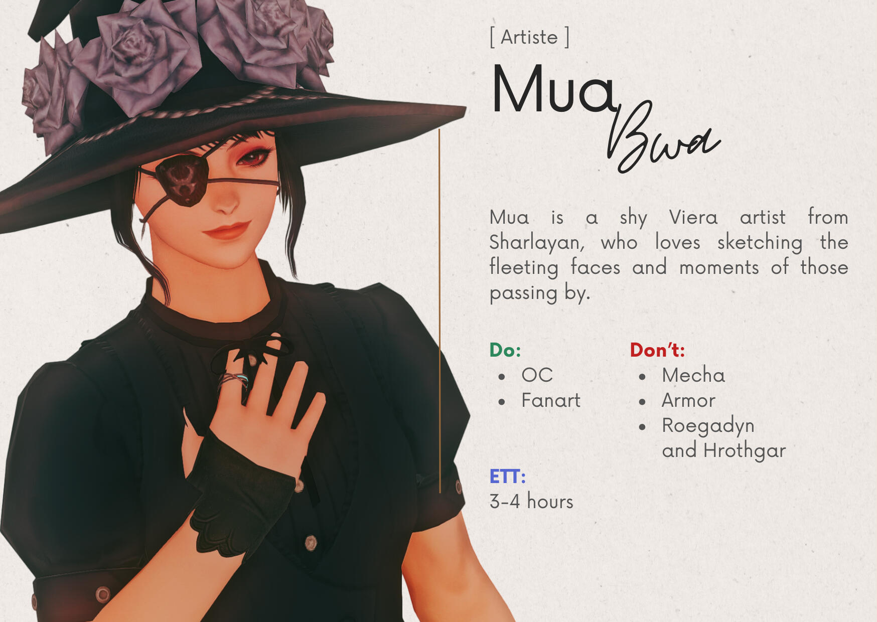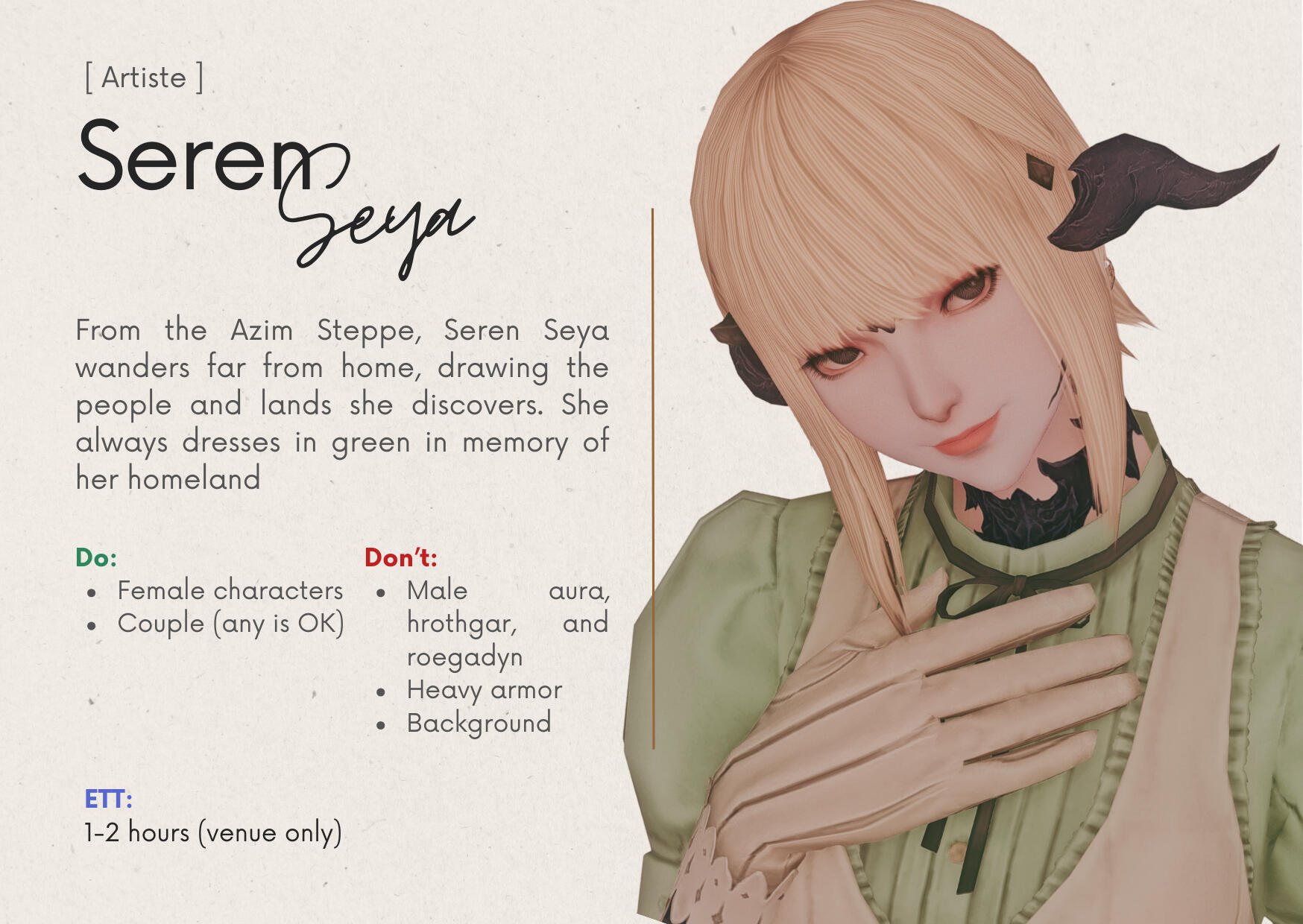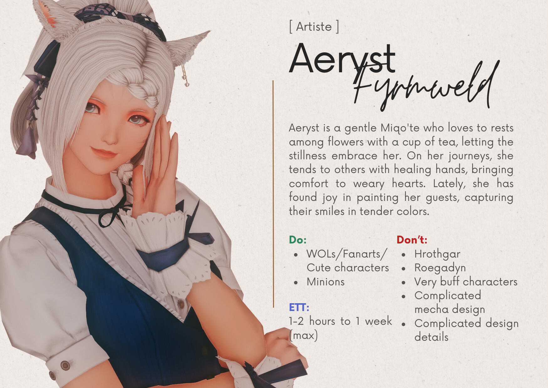 Artists may decline requests that don’t align with their style or fall outside their drawing preferences.Guests can send 'Tell' to Staff/Sommelier for further discussion.