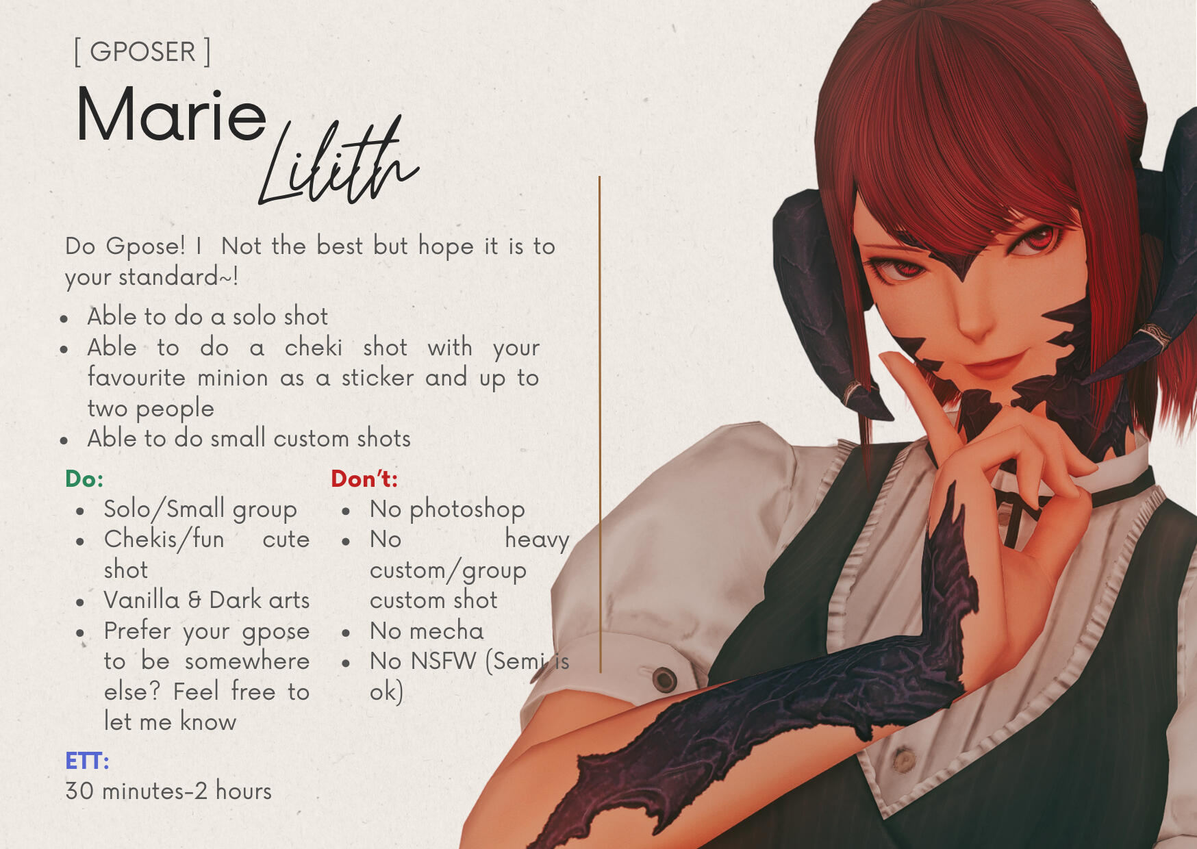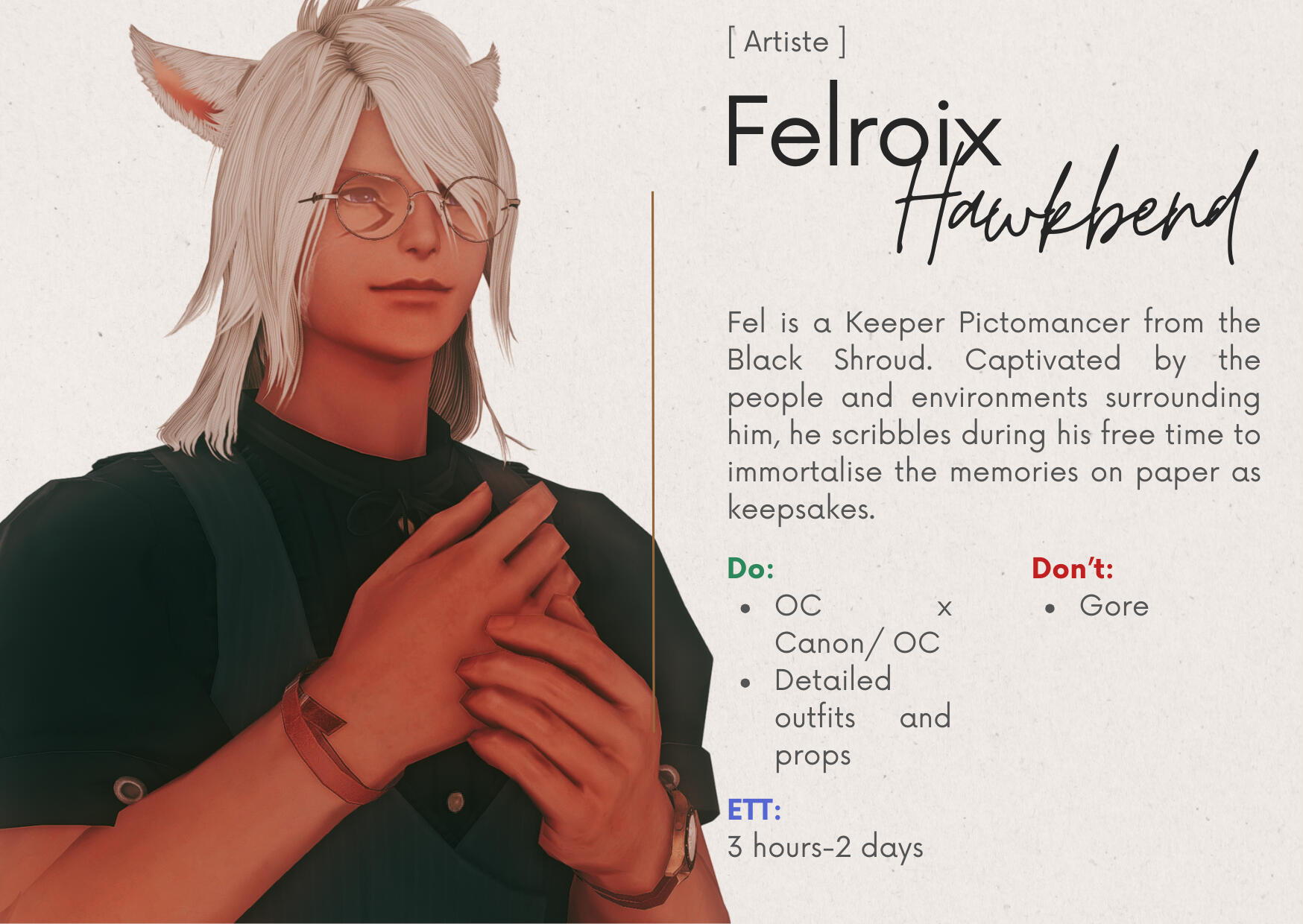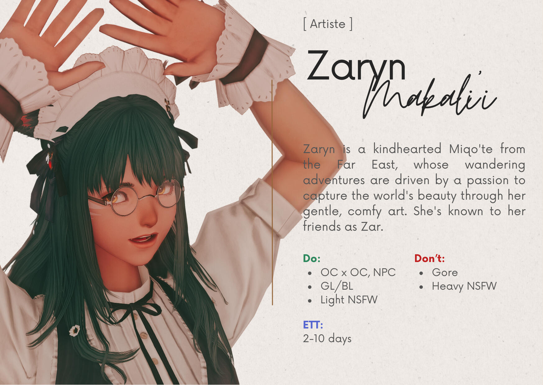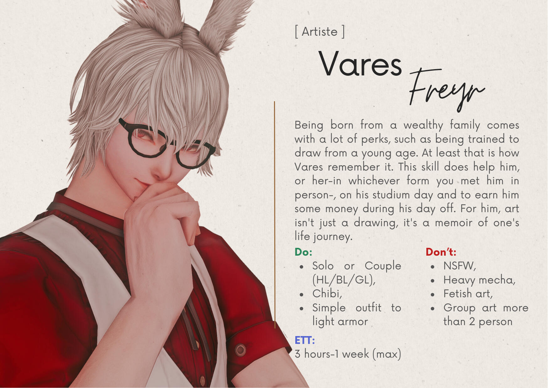 Artists may decline requests that don’t align with their style or fall outside their drawing preferences.Guests can send 'Tell' to Staff/Sommelier for further discussion.